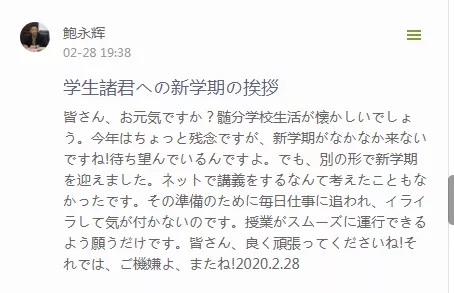 这场突如其来的疫情,打乱了我们生活的节奏,各行各业都受到疫情的影响。作为一名教师,为了保证每位学生能够参与到线上学习之中,能够顺利开展线上教学,对于从没有接触过此种方式的我们而言,是一种全新的挑战。白衣天使们面对新型冠状肺炎危及自己生命安全时,人人迎险而上,战斗在一线,给我们全体教师树立了迎难而上的榜样,也激励我们全体教师的热情与信心。停课不停学,我们工学院全体教师也在行动,共同为战胜疫情出一份力,尽一份责。希望疫情早日过去,让这个春天能继续充满希望,寄语洛城风道日,明年春色倍还人。