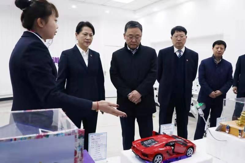 首先,市文广旅局领导一行参观考察了学校独具特色的天井景观带;在人工智能实训室体验了景区智能语音导引机器人,在VR虚拟仿真实训室体验了VR实景模拟教学;观摩了大学生创客中心、师生美术设计作品展、文创作品展,观看了“新时代 新长旅”办学成果展,系统了解了学校近年来各项事业发展情况和办学特色。