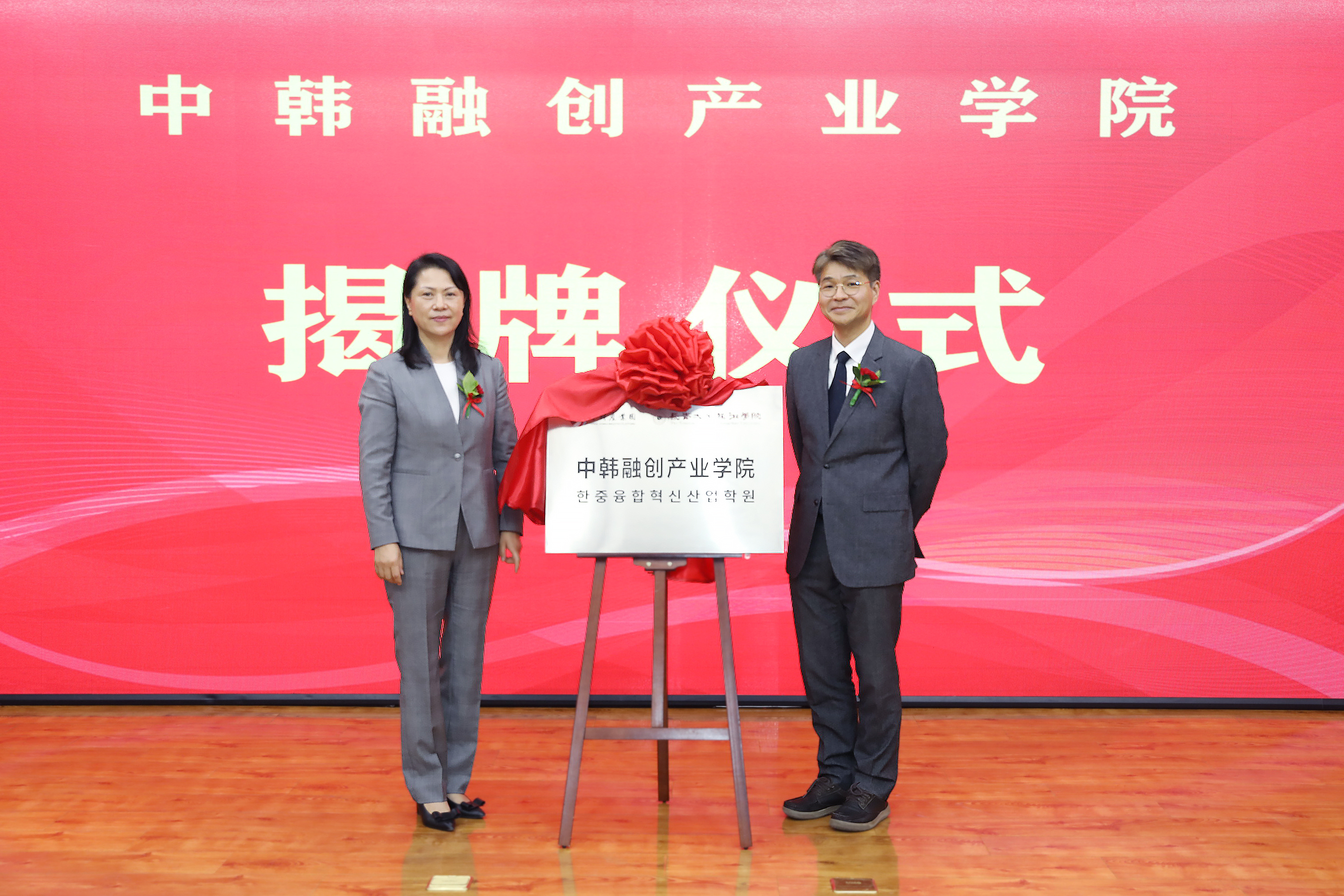 郑晓明、金来湘共同为“中韩融创产业学院”、“中韩服装时尚设计研创中心”揭牌。